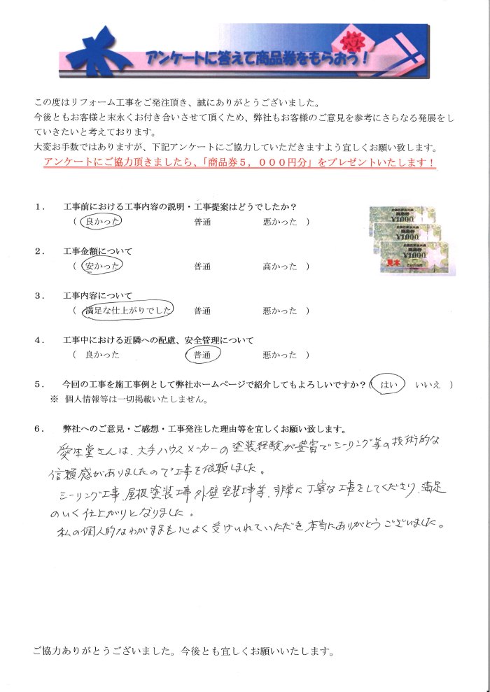 愛生堂さんは大手ハウスメーカーの塗装経験が豊富でシーリング等の技術的な信頼感がありましたので工事を依頼しました。シーリング工事、屋根塗装工事、外壁塗装工事等非常に丁寧な工事をしてくださり満足のいく仕上がりとなりました。私の個人的なわがままも心よく受け入れていただき本当にありがとうございました。