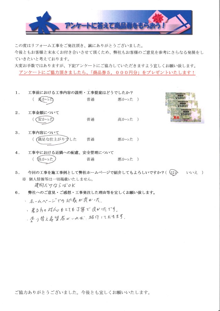 常滑市で外壁塗装リフォームをされたお客様の声 1.工事前における工事内容の説明・工事提案はどうでしたか? 良かった 2.工事金額について 安かった 3.工事内容について 満足な仕上がりでした 4.工事中にあける近隣への配慮安全管理について 良かった 5.弊社へのご感想・工事発注した理由等を宜しくお願い致します。 ホームページでの印象が良かった。来る方の対応もとても丁寧で良かったです。塗り替え希望者がいれば紹介しておきます。 ホームページでの印象が良かった。来る方の対応もとても丁寧で良かったです。塗り替え希望者がいれば紹介しておきます。 前の記事 次の記事 一覧へ戻る