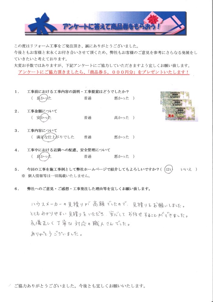 ハウスメーカーの見積りが高額でしたので見積りをお願いしました。とてもわかりやすい見積りをいただき、安心してお任せすることができました。礼儀正しく丁寧な対応の職人さんでした。ありがとうございました。