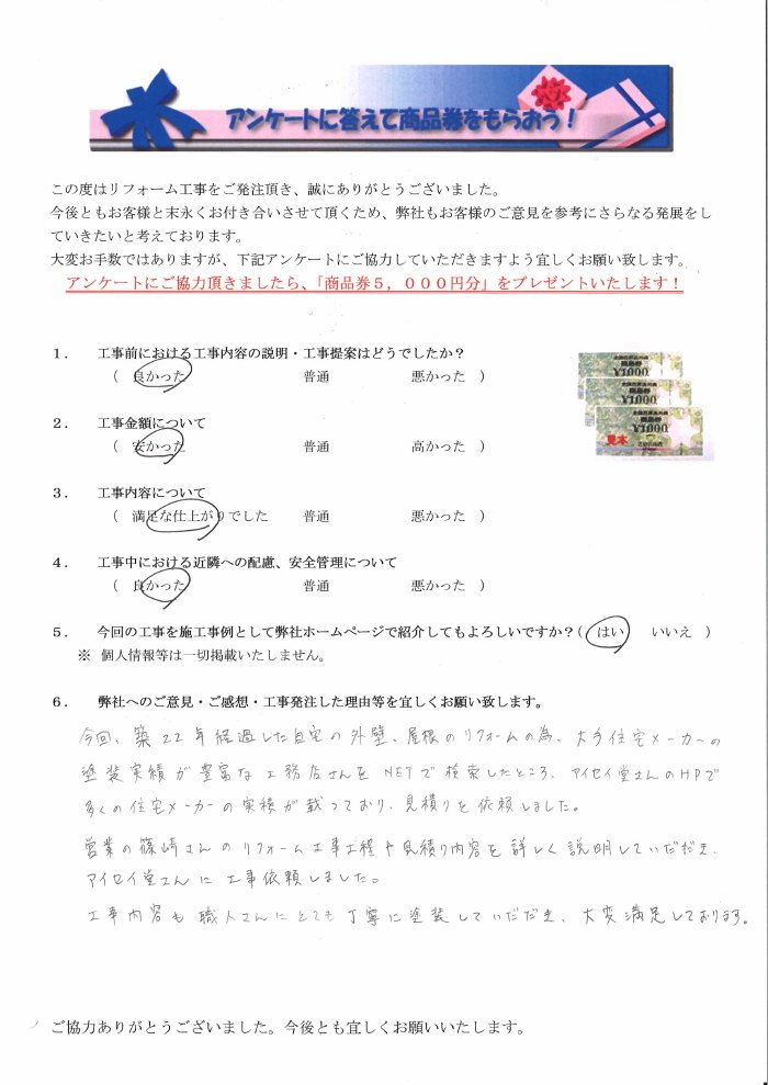 今回、築22年経過した自宅の外壁、屋根のリフォームの為、大手住宅メーカーの塗装実績が豊富な工務店さんをNETで検索したところ、アイセイ堂さんのHPで多くの住宅メーカーの実績が載っており、見積りを依頼しました。営業の方のリフォーム工事工程や見積り内容を詳しく説明していただきアイセイ堂さんに工事依頼しました。工事内容も職人さんにとても丁寧に塗装していただき大変満足しております。