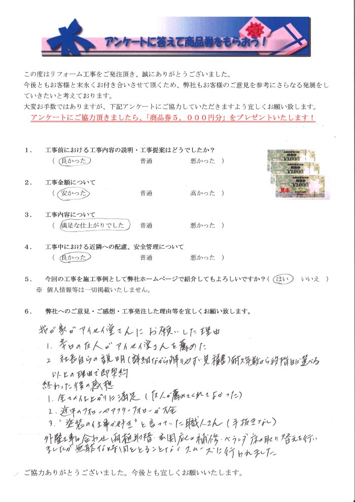我が家がアイセイ堂さんにお願いした理由。辛口の友人がアイセイ堂さんを薦めた。社長自らの説明(詳細ながら解りやすい見積書)耐久年数から段階的に選べる。以上の理由で即契約。終わった後の感想。全ての仕上がりに満足(友人が薦めてくれてよかった)。途中のフォローやアフターフォローが万全。塗装の仕事が好きと言っていた職人さん(手抜きなし)。外壁工事と合わせ雨樋取替、玄関庇の補修、ベランダ床の取替を行いましたが無駄な時間をとることなくスムーズに行われました。