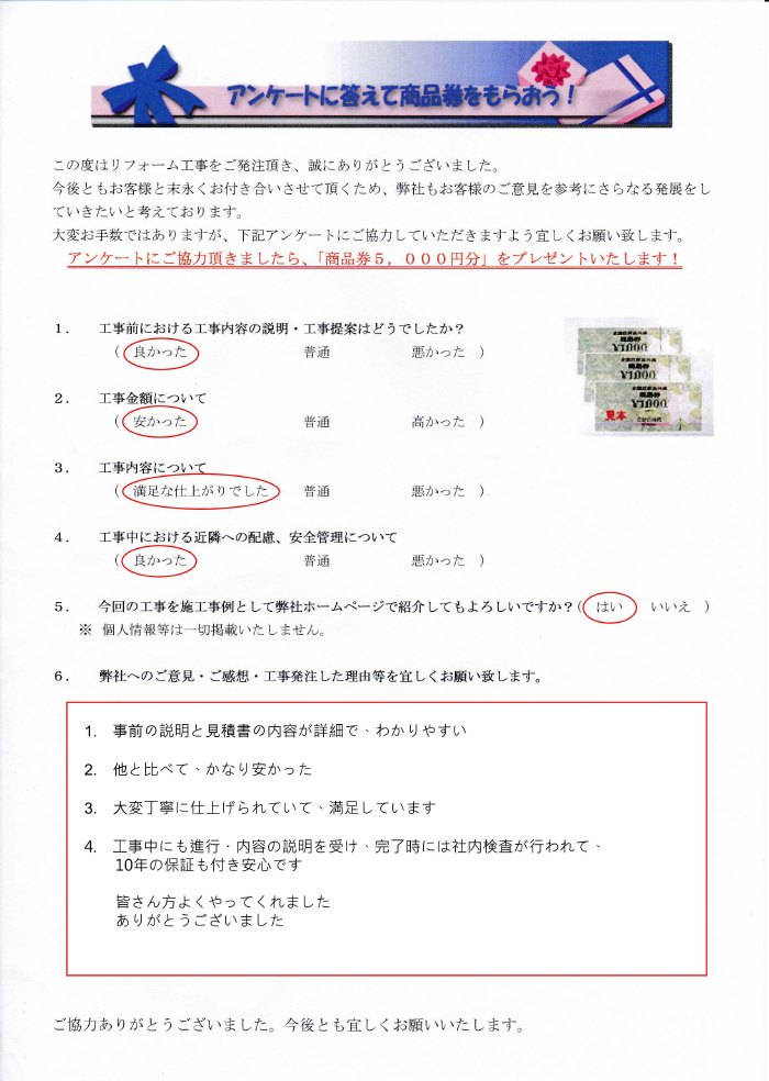 事前の説明と見積書の内容が詳細でわかりやすい。他と比べかなり安かった。大変丁寧に仕上げられていて満足しています。工事中にも進行・内容の説明を受け、完了時には社内検査が行われて、10年保証もつき安心です。皆さん方よくやってくれました。ありがとうございました。