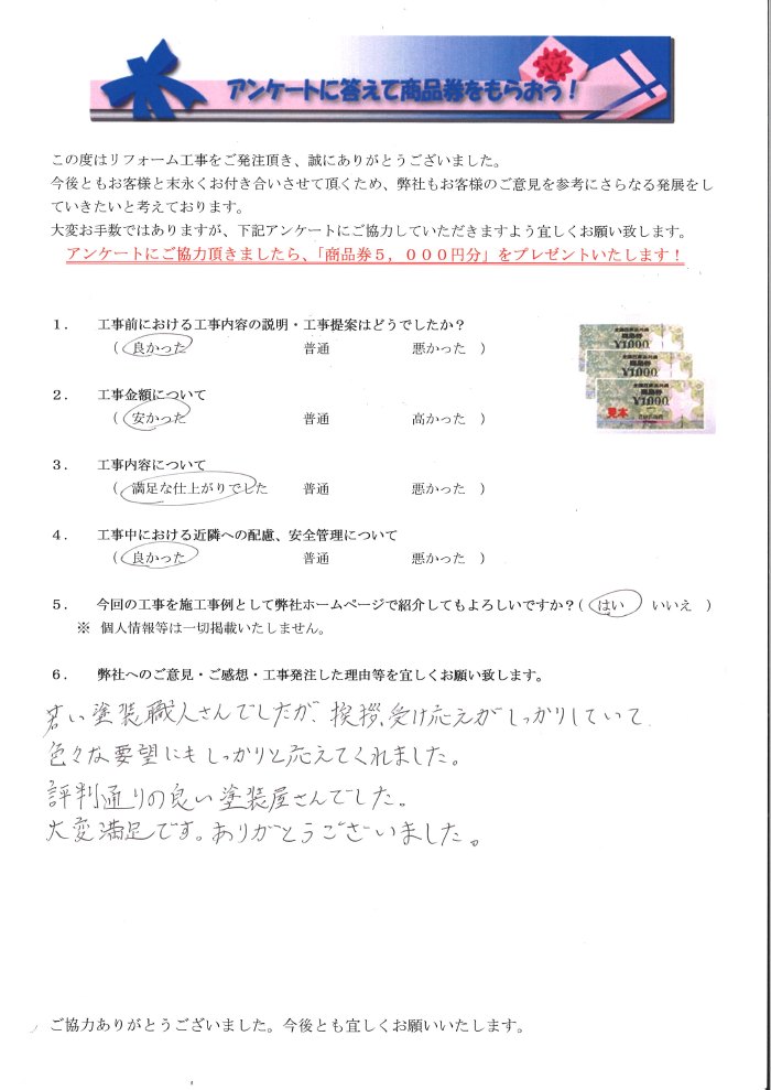 若い塗装職人さんでしたが、挨拶、受け応えがしっかりしていて、色々な要望にもしっかりと応えてくれました。評判通りの良い塗装屋さんでした。大変満足です。ありがとうございました。