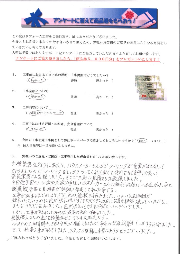 外壁塗装を行うにあたり、ハウスメーカーさんからシーリングが重要だと伺っておりましたのでシーリングをしっかりとやってくれて安くて信用できて評判の良い塗装業者さんを探しました。そこで三社に見積りを依頼しました。今回アイセイ堂さんに決めた決め手はハウスメーカーさんの施工内容に一番近かった事と調査報告書と見積書が詳細に作成してあった事です。工事が始まるまでの2ヶ月間、色の選択に悩みました。いよいよ足場組が始まったというのに色が決まらず、アドバイザーの方に何度も相談に乗っていただき、ぎりぎりまで悩みました。色が決まってからも不安でいっぱいでした。しかし、工事が終わってみれば最高の色合いでした。塗装職人さんの早くて綺麗な仕上げにも大満足です。10月中の工事期間中、3回も台風が接近しましたが、事前の台風対策もしっかり行われました。そして、無事工事が終了しました。スタッフの皆様本当にありがとうございました。