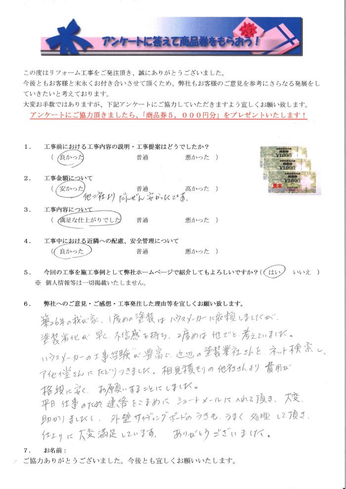 築26年の我が家、1度目の塗装はハウスメーカーに依頼しましたが塗装劣化が早く不信感を持ち、2度目は他でと考えていました。ハウスメーカーの工事経験が豊富で近辺の塗装業者さんをネット検索し、アイセイ堂さんにたどりつきました。相見積りの他社さんより費用が格段に安く、お願いすることにしました。平日、仕事のため連絡をこまめにショートメールに入れて頂き、大変助かりました。外壁サイディングボードの浮きもうまく処理して頂き、仕上りに大変満足しています。ありがとうございました。