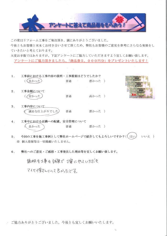 名古屋市緑区で旭化成ヘーベルハウス外壁塗装リフォームをされたお客様の声 1.工事前における工事内容の説明・工事提案はどうでしたか? 良かった 2.工事金額について 安かった 3.工事内容について 満足な仕上がりでした 4.工事中にあける近隣への配慮安全管理について 良かった 5.弊社へのご感想・工事発注した理由等を宜しくお願い致します。 説明も工事も誠実で丁寧にやっていただきアイセイ堂さんにして良かったです。 説明も工事も誠実で丁寧にやっていただきアイセイ堂さんにして良かったです。 ORDER このお客様の施工内容 名古屋市緑区 旭化成ヘーベルハウス外壁塗装リフォーム 費用:202万円/工期:13日 前の記事 次の記事 一覧へ戻る