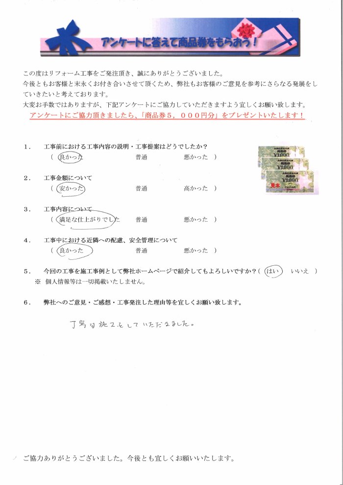 北名古屋市で外壁塗装リフォームをされたお客様の声 1.工事前における工事内容の説明・工事提案はどうでしたか? 良かった 2.工事金額について 安かった 3.工事内容について 満足な仕上がりでした 4.工事中にあける近隣への配慮安全管理について 良かった 5.弊社へのご感想・工事発注した理由等を宜しくお願い致します。 丁寧な施工をしていただきました。 丁寧な施工をしていただきました。 前の記事 次の記事 一覧へ戻る