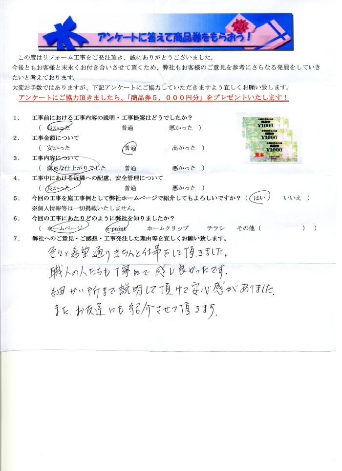 色々と希望通りきちんと仕事をして頂きました。職人の人たちも丁寧で感じ良かったです。細かい所まで説明して頂けて安心感がありました。また、お友達にも紹介させて頂きます。