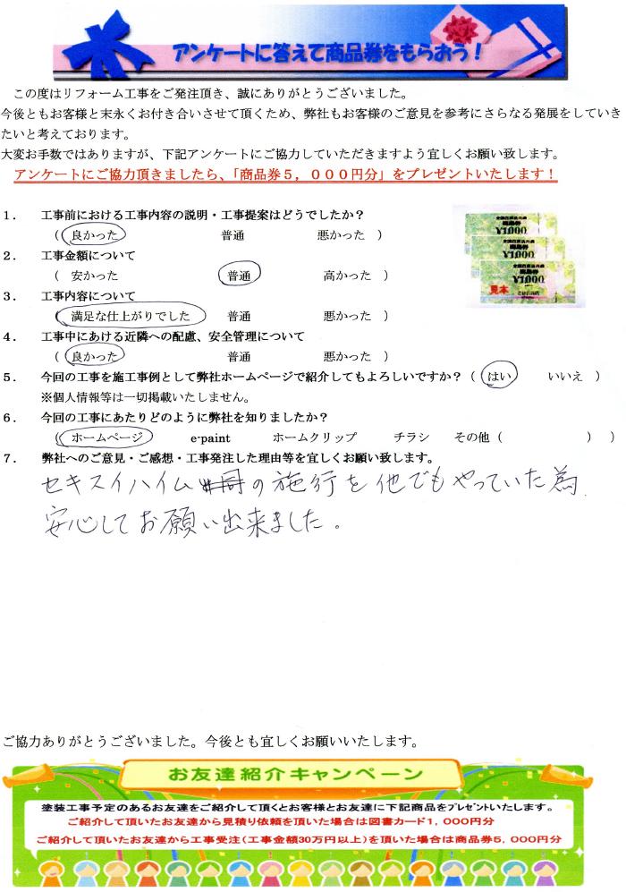 あま市で外壁塗装リフォームをされたお客様の声 1.工事前における工事内容の説明・工事提案はどうでしたか? 良かった 2.工事金額について 普通 3.工事内容について 満足な仕上がりでした 4.工事中にあける近隣への配慮、安全管理について 良かった 5.弊社へのご感想・工事発注した理由等を宜しくお願い致します。 セキスイハイムの施工を他でもやっていた為安心してお願い出来ました。 セキスイハイムの施工を他でもやっていた為安心してお願い出来ました。 前の記事 次の記事 一覧へ戻る