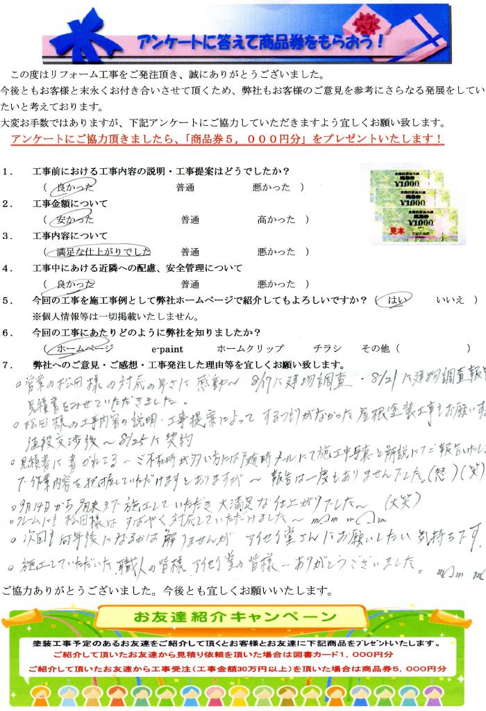 営業の方の対応の早さに感動。大変満足な仕上がりでした。クレームにもすばやく対応して頂けました。次回も何年後になるかは解りませんがアイセイ堂さんにお願いしたい気持ちです。施工して頂いた職人の皆様、アイセイ堂の皆様ありがとうございました。