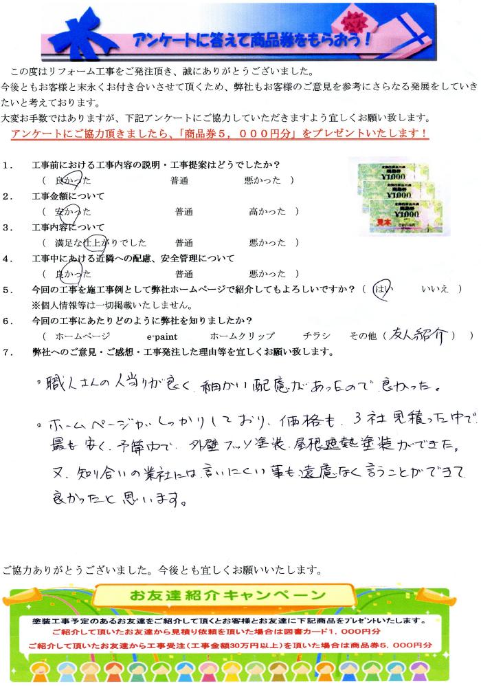 職人さんの人当たりが良く、細かい配慮があったので良かった。ホームページがしっかりしており、価格も3社見積った中で最も安く予算内で外壁フッソ塗装、屋根遮熱塗装ができた。又、知り合いの業者には言いにくい事も遠慮なく言うことが出来て良かったと思います。