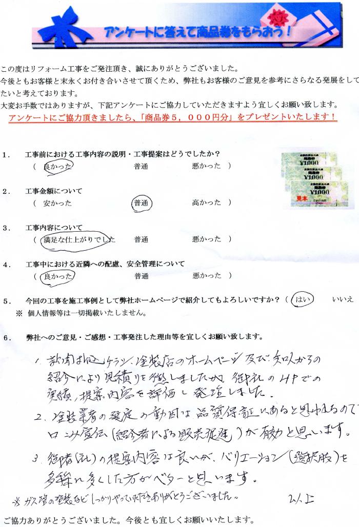 新聞折込チラシ、塗装店のホームページ及び知人からの紹介により見積を致しましたが御社のHPでの実績、提案内容を評価し発注しました。塗装業者の選定の動因は品質保証にあると思われるので口コミ宣伝(紹介者による販売促進)が有効と思います。御社の提案内容は良いがバリエーション(選択肢)を多様に多くした方がベターと思います。ガス管の塗装などしっかりやって頂きありがとうございました。