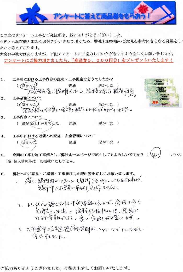 若し、建物内のリフォーム(台所)も行っているのであれば、数年中にお願いするかもしれません。HPでの施工例を十分確認した上で今回の工事をお願いしました。依頼する側としては参考になる情報でした。良い企画だと思います。工事途中の経過連絡も定期的にメールで頂き安心できました。