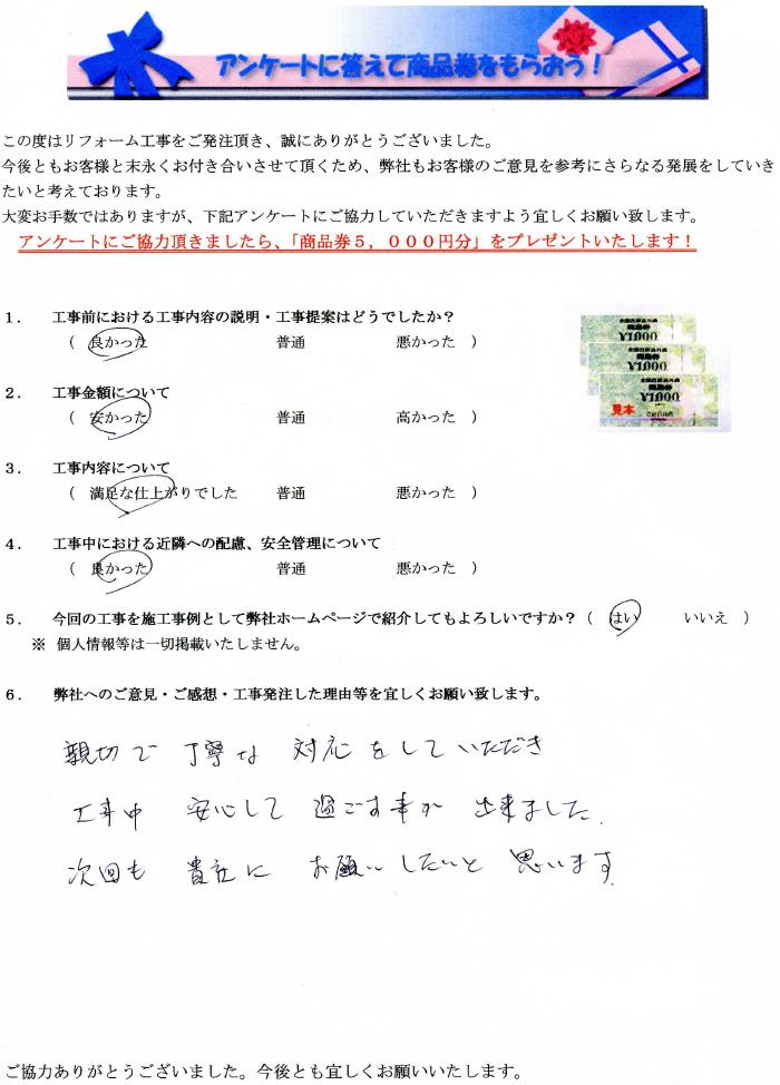 清須市で外壁塗装リフォームをされたお客様の声 1.工事前における工事内容の説明・工事提案はどうでしたか? 良かった 2.工事金額について 安かった 3.工事内容について 満足な仕上がりでした 4.工事中にあける近隣への配慮、安全管理について 良かった 5.弊社へのご感想・工事発注した理由等を宜しくお願い致します。 親切で丁寧な対応をして頂き、工事中安心して過ごす事が出来ました。次回も貴社にお願いしたいと思います。 親切で丁寧な対応をして頂き、工事中安心して過ごす事が出来ました。次回も貴社にお願いしたいと思います。 前の記事 次の記事 一覧へ戻る