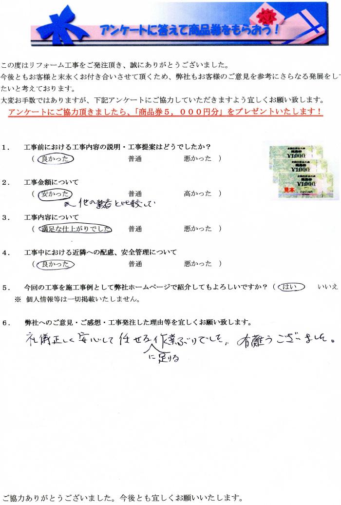 名古屋市守山区で外壁塗装リフォームをされたお客様の声 1.工事前における工事内容の説明・工事提案はどうでしたか? 良かった 2.工事金額について 安かった 3.工事内容について 満足な仕上がりでした 4.工事中にあける近隣への配慮、安全管理について 良かった 5.弊社へのご感想・工事発注した理由等を宜しくお願い致します。 礼儀正しく安心して任せるに足りる作業ぶりでした。有難うございました。 礼儀正しく安心して任せるに足りる作業ぶりでした。有難うございました。 前の記事 次の記事 一覧へ戻る