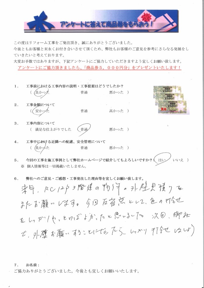来年RC12戸3階建の物件の外壁見積りをまたお願いします。今回反省点として色の打合せをしっかりやっとおけばよかったと思いました。次回御社で外壁お願いすることになったらしっかり打合せしましょう。