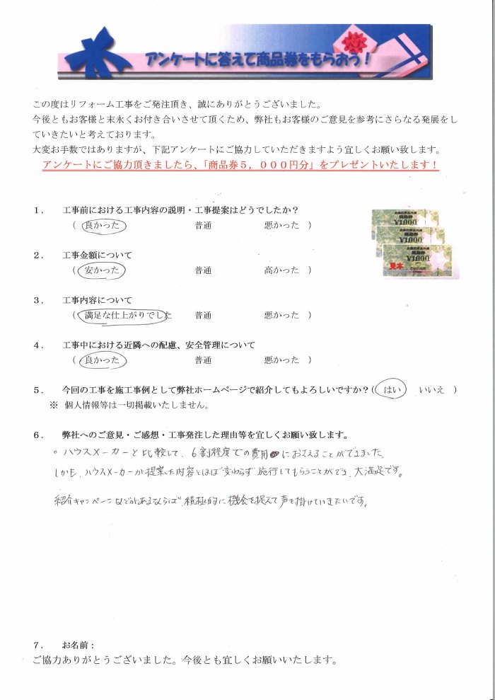 ハウスメーカーと比較して6割程度での費用におさえることができました。しかも、ハウスメーカーが提案した内容とほぼ変わらず施工してもらうことができ、大満足です。紹介キャンペーンなどがあるならば、積極的に機会を捉えて声をかけていきたいです。