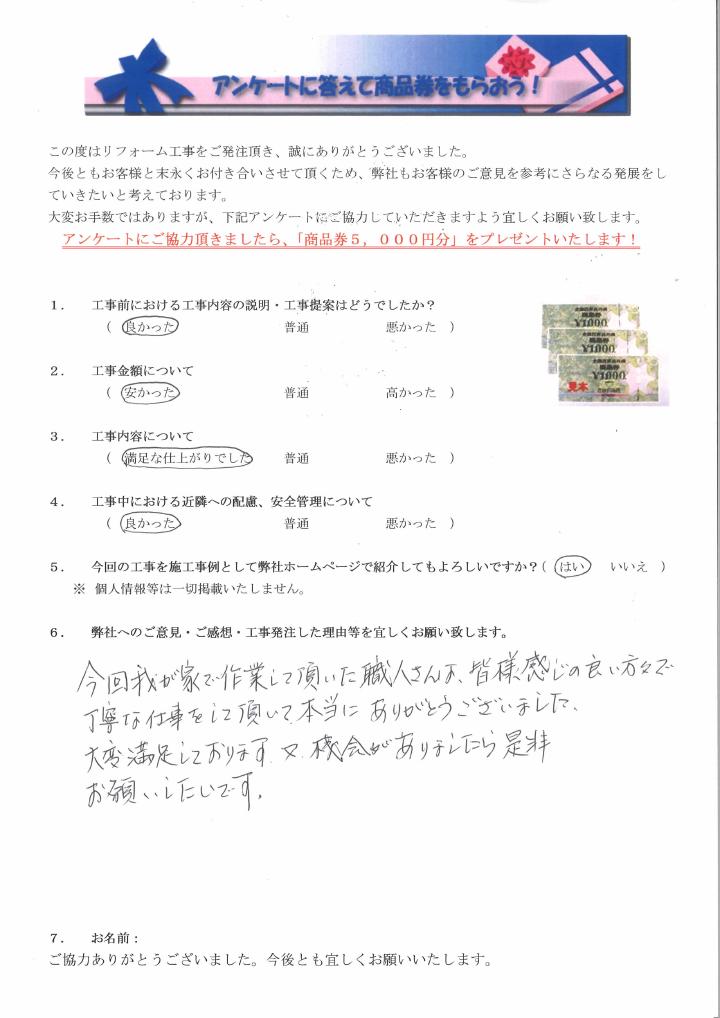 今回我が家で作業して頂いた職人さんは皆様感じの良い方々で丁寧な仕事をいて頂いて本当にありがとうございました。大変満足しております。又、機会がありましたら是非お願いしたいです。