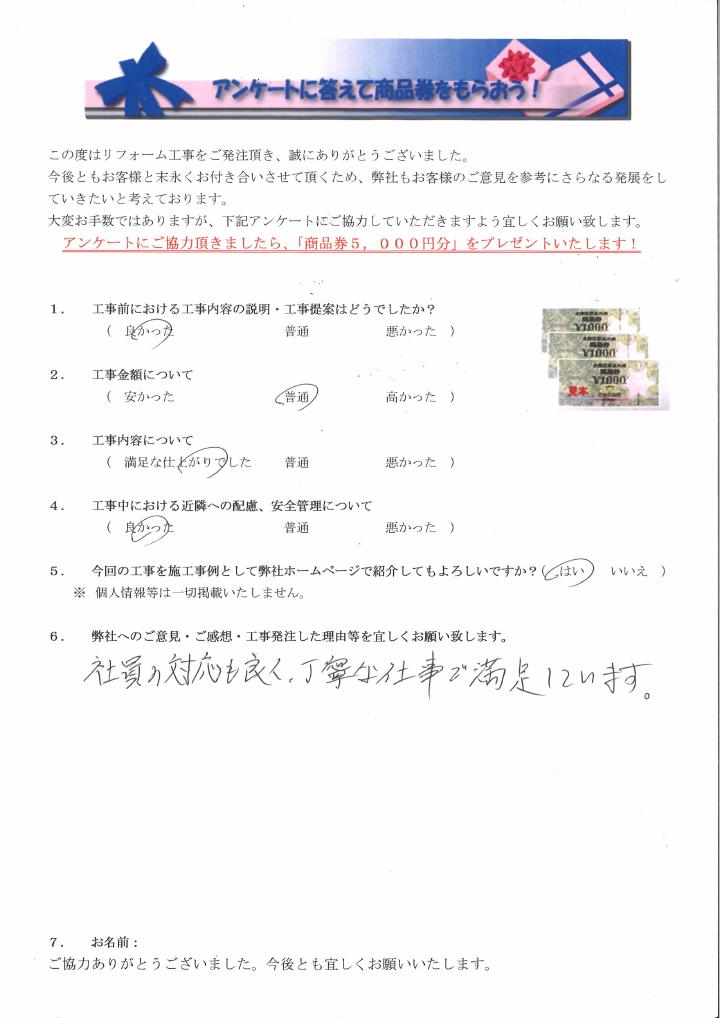 各務原市でパナホーム外壁塗装リフォームをされたお客様の声 社員の対応も良く、丁寧な仕事で満足しています。 1.工事前における工事内容の説明・工事提案はどうでしたか? 良かった ふつう 悪かった 2.工事金額について 安かった ふつう 高かった 3.工事内容について 満足な仕上がりでした ふつう 悪かった 4.工事中における近隣への配慮安全管理について 良かった ふつう 悪かった 5.弊社へのご感想・工事発注した理由等をよろしくお願いいたします。社員の対応も良く、丁寧な仕事で満足しています。 ORDER このお客様の施工内容 各務原市 パナホーム外壁塗装リフォーム パナホームの建物を外壁塗装リフォームしました。外壁塗装、付帯部塗装、鉄部塗装、シーリング工事を実施しました。費用:120万円/工期:13日 前の記事 次の記事 一覧へ戻る