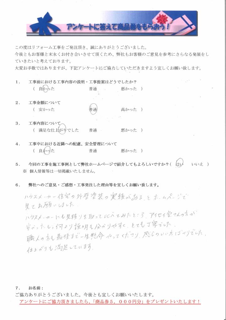 ハウスメーカー住宅の外壁塗装の実績があるとホームページで見てお願いしました。ハウスメーカーにも見積りを取って比べてみたところアイセイ堂さんの方が安かったし、何より説明も分かりやすく、とても丁寧でした。職人の方も最後まで一生懸命やってくださり、感じのいい方ばかりでした。仕上がりも満足しています。